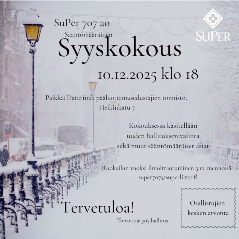 Ruokailun vuoksi ilmoittautuminen super707@superliitto.fi 3.12.2025 mennessä